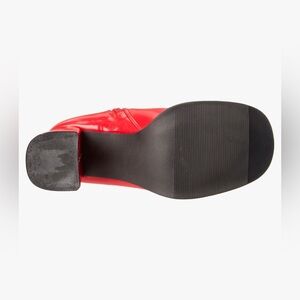 Novelty go-go boot in glossy finish featuring chunky molded heel and split-toe stitching