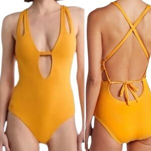 BECCA Split Strap Keyhole One Piece Swimsuit! Color - Marigold/yellow. Retail $130. Beautiful plunge neck swimsuit featuring a split strap, back lace up design. Lightly padded cups with elastic band underneath for support. Moderate coverage. Lined. 83% nylon, 17% spandex. New without tags.