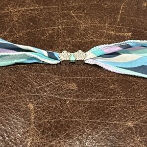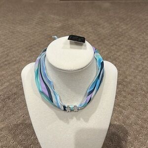 Beautiful turquoise, lilac & purple Pucci style fabric choker with flower rhinestones !! Measures approximately 17 1/2 to 18 inches in length. Tie ends around neck like a bandana. Classic & contemporary fashion jewelry necklace !!