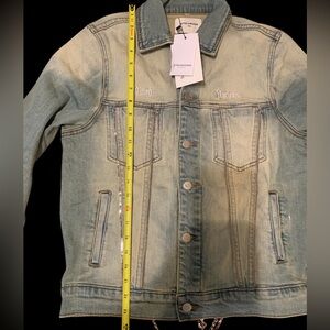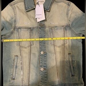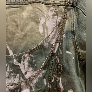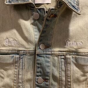 Lifted Anchors Jean Jacket Mens Small. Fashionable design. Chains on back of jacket with angel character design. See all pics through for better details. Width approx: 19 inches with length of approx: 23 inches. All sales final, no returns