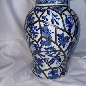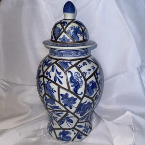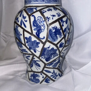 This is a modern vintage stylized Chinese blue and white Lidded Jar hand painted with floral and leaf on geometric crackled matrix pattern motif made in the 2nd half of the 20th century c.1950-70. The six Kaishu character motif means "Summoning Heavenly Water Mine Grounding"