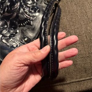 Preloved in perfect condition doesn’t come withh a crossbody strap has d rings for one. Is very dark black with a blueish tint look cutout on front has a foiled look underneath