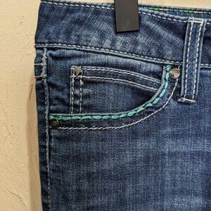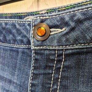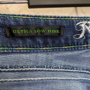 FEATURES/ACCENTS: Western cut Straight boot cut leg. Medium wash cotton blend with light stretch. Ultra low rise. Heavily embellished and embroidered feather back flap pockets. Jewel button detail. Zip fly. 5 pocket design.