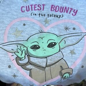 Baby Yoda Cutest Bounty in the galaxy Star Wars 3 toddler sized T-shirt. Grey, ruffled short sleeves for a girlhood flare. This shirt is part of the Star Wars sand Lucasfilm ltd merchandise. Previously loved