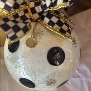 This listing is for a Mackenzie Childs NIB Christmas Snowflake capiz ornament. It is decorated with black and gold snowflakes and dots. Has the checked black and white bow and gold tag. Measures approximately 4”.