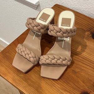 Textured leather with a handle and longer, detachable strap. The color is a beautiful, muted lavender. There are 3 pockets inside with one zipper pocket.