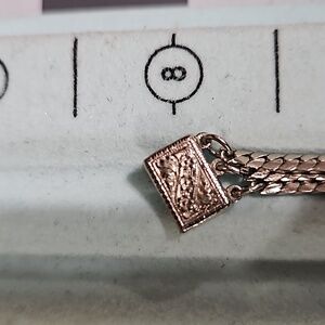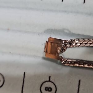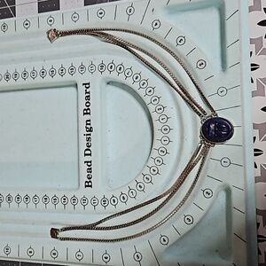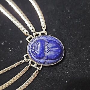 This necklace is preloved in great condition. She features a carved scarab in either glass or stone. She has three chains attached on each side of the pendent. Her closure is an ornate slide in. She is approximately 16".