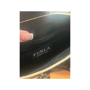 Great condition. Vintage FURLA black smooth leather shoulder bag. Structured Italian leather purse. Double strap. Full zip closure. Oversized silver tone FURLA branded front toggle closure. Interior is fully lined with signature FURLA logo fabric. Interior zip pocket. Original dust bag. Made in Italy. There is a slight scuff mark on the front of the bag. No wear and tear. Bag will smooth out when filled. The straps are a little stiff- otherwise this bag is in excellent vintage condition. 12 inches wide. 8.5 inches high.