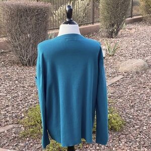 PICS DO NOT ACCURATELY REFLECT COLOR. IT IS A MEDIUM GREEN, BUTTON DOWN FRONT. ROUNDED NECKLINE, SMALL POCKET ON LEFT LONG SLEEVE, ALSO ON BOTH SLEEVE HEMS THERE ARE THREE SMALL BUTTONS THAT CAN BE UNBUTTONED, SEE PICS, 100% COTTON, SIZE 1X