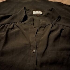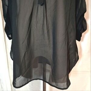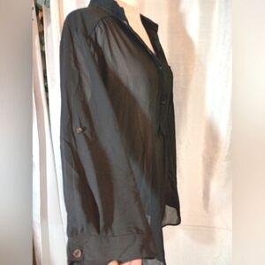 Style and Color: Women blouse, Black , see thru, 1/2 button up front, 3/4 roll tab sleeves that roll into 1/2 sleeve, front pocket.