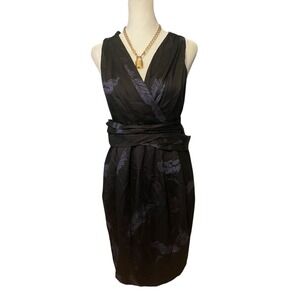 Stunning Marc Jacobs wrap dress in deep black with subtle dark purple feather print. Elegant crossover bodice with dramatic cross-back design and wrap waist closure creates a flattering, sculpted silhouette. Lightweight silk blend with soft drape and fully lined interior for comfort and structure. Polished, timeless piece perfect for cocktail events, evenings out, weddings, or special occasions.