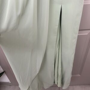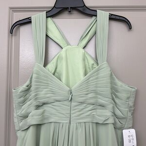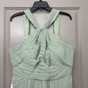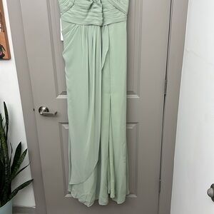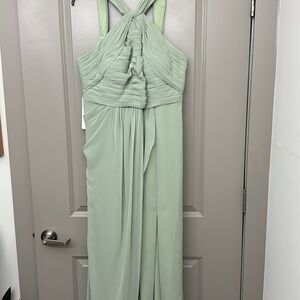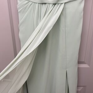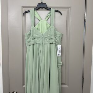 Azazie dusty sage floor length gown. Zipped back. Perfect for a wedding, special event or bridesmaid. Never worn. This dress was made for me so the measurement’s are bust: 42.25 waist: 37.25 hips: 46.75. New with tags. May need to be altered to fit you. Comes with original garment bag. I have listed it as a large but make sure you read the measurements so that it fits correctly.