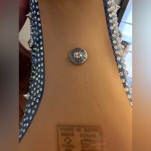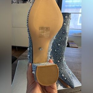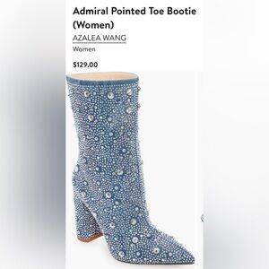 Dazzling embellishments add a dose of glam to a stylish denim bootie balanced by a pointy toe and wrapped block heel.