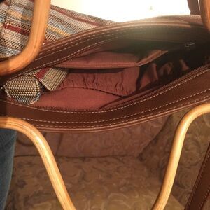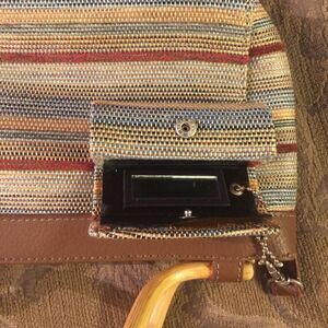 Brown striped Handbag by Worthington. Wood handles and detachable strap. Lipstick case with mirror included. Zipper closure. Interior pocket and punches. Measurements: 11.5" long 7" tall 2.5" wide wood handles 4.5" strap 20". Great used condition. All orders are shipped same or next business day. Bundle to save even more money!