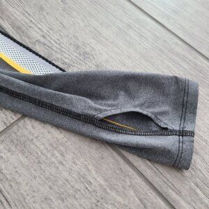 Grey with yellow and white stripe along sleeves. Silver PINK dog charm on zipper and finger holes for thumbs