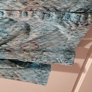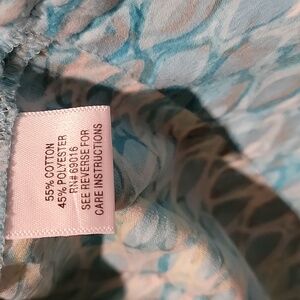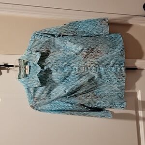Beautiful blouse! 3/4 length sleeves. Buttons down the front. Bottom seam is designed to be worn out. Flattering darts. For casual or the office. Approximate measurements are 18" from pit to pit and 22" from shoulder to hem. Comes from a smoke and pet free home.