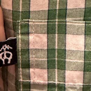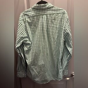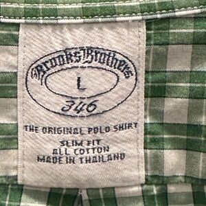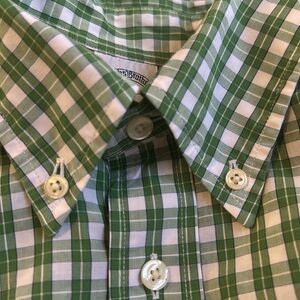 This button down men’s shirt from Brooks Brothers is size large and is 100% cotton. It is green and white plaid. Collar buttons down (last photo). Excellent condition.