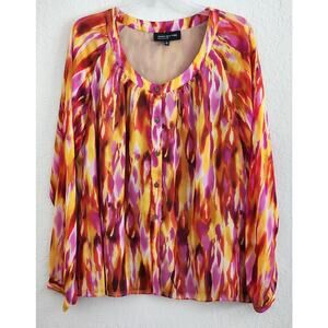 Nice light weight jacket that could be used as a top. It is Pushpa brand that is new with the tags. The jacket is a black material. There are numerous appliques that are a bright city scape on the front, back and on the end of the sleeves. There are metallic threads throughout to give it a bit of a sparkle. It has a nice weight and feel to it. The size is a small, but it looks like generous sizing. The outside is a cotton and the lining is a rayon. There are nice black buttons down the front. SIZE SMALL