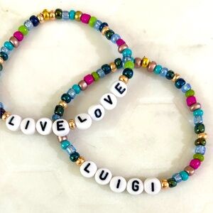 Custom handmade friendship bracelets. Set of 2. Made with Czech glass or clay beads and white clay letters on sturdy stretch 7mm cord.