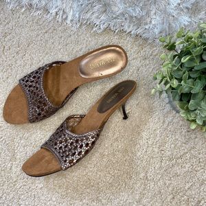 Brown cargo crop pants from New York & Company. Size 8; 100% cotton. Bottoms feature slant and zipper pockets on the hip, cargo pockets on the thigh, and ties at the ankle; cargo flap pockets on the rear; beltloops. Excellent used condition. Comes from a smoke-free, pet-free home.