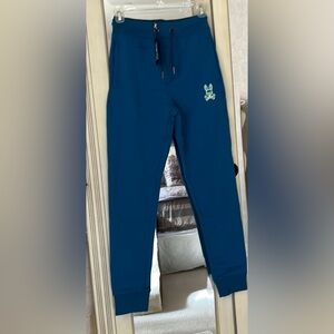 NWT Psycho Bunny teal sweatpants w/ white & Green Psycho Bunny logo on front left leg. 3 zipper pockets, elastic band waist w/ drawstring. Unisex, and can fit adult females who wear jean sizes 23-25.