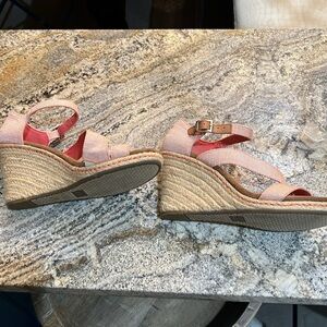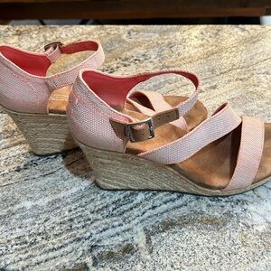Toms wedge sandals. So cute!! Color is peachy and gray. So comfortable! Size W9. But I don’t wear wide and they fit fine! Great pre loved condition!!