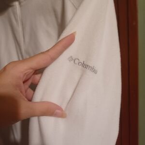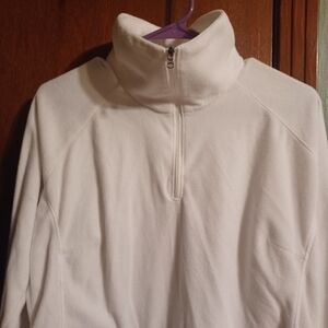 Cozy white fleece pullover. Features a quarter-zip design. Perfect for layering.