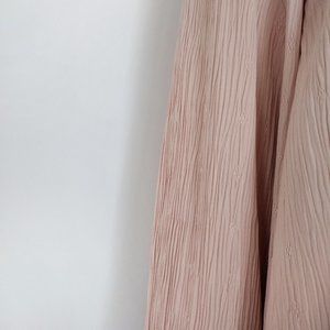 Vintage late 1980s jacket, featuring an open front design, and 3/4 length, cuffed sleeves. It has an asymmetric shaped hem. The color is a nice, muted dusty pink. Made from very lightweight, crinkled fabric. It has subtle, checkered embroidered stitching throughout. Attached shoulder pads. Unlined. No pockets. Made in the USA.