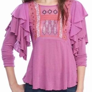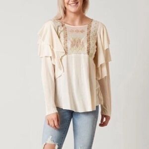 From Chico’s you'll have no trouble getting noticed in their Satin Chenille Smocked Blouse. The silky smooth fabric is adorned with floral tone chenille embellishments on the neckline and smocked cuffs, making it so easy to wear and style Bust 24” flat Length 28.5". Classic fit, v neck.Fabric 100% Polyester