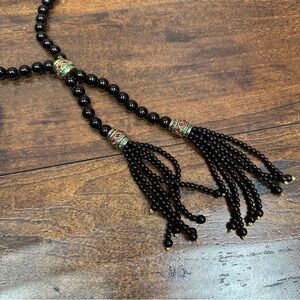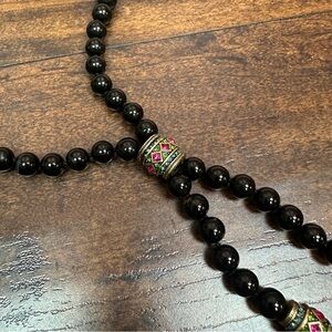 Heidi Daus choker style necklace long black beaded tassels pink & green stones