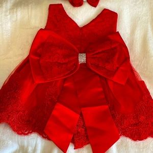 New without tags beautiful Red Dress with lace & Bows, , large bow attaches to the back, red bow for the hair, zip back, Size 3 Months