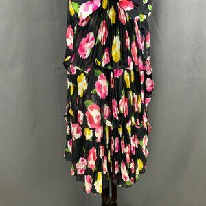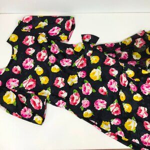 Vintage 80's Stunning Pure Silk Dress With Black Background Print and Colorful Roses. Puff sleeves, shoulder pads, side bow and chiffon pleating, long concealed back zipper, lined. 100% quality silk. Made in Korea. Excellent vintage condition. The dress was photographed on mannequin size 6.