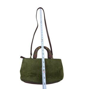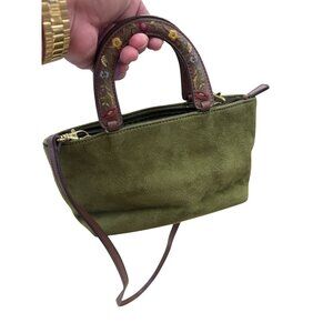 This crossbody bag combines the elegance of green suede with the durability of brown leather. The floral embroidery on the handle adds a unique touch, while the versatile design transitions seamlessly from day to night. Ideal for those who appreciate classic styles with a modern twist. This bag is pretty. Does have a minor stain on inside fabric where i point at in pic but no other defects and its ready to ship today! SKU 7056