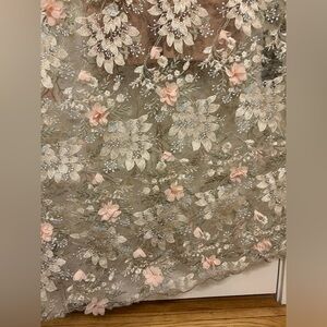 Fluttery appliqués create a lovely 3D effect on a sleeveless A-line gown featuring a plunging décolleté neckline and a sweeping peekaboo skirt.