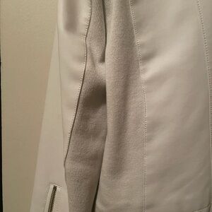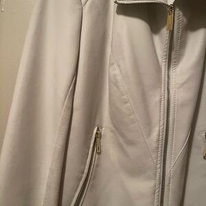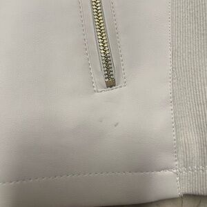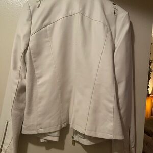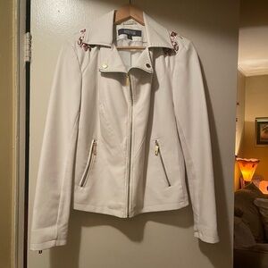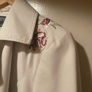Elevate your style with this chic white faux leather jacket. Featuring elegant floral embroidery on the shoulders, it's perfect for any occasion. The sleek design and zippered pockets add a modern touch.