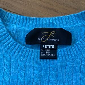 Beaut blue pure cashmere sweater in size petite medium. In great shape overall, but does have a small hole in the back as shown in the photos