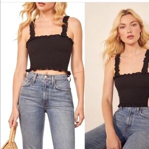 Reformation Leonore Smock Crop Top in black. Purchased at Nordstrom Like ice cream on a hot summer day, this soft and smocked crop top with ruffle edges and straps is definitely sweet and refreshing. The fact that it's made in America using sustainable practices makes it even more precious.
