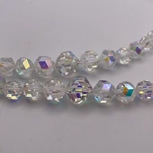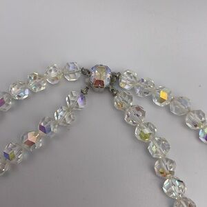 Stunning vintage two stranded AB crystal necklace 21 inches on the shortest strand end to end. The largest crystal bead is 5/8 of an inch in diameter. It has a hidden clasp.