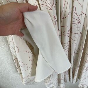 Features: cream white with pink leaves print pleated skirt long sleeve