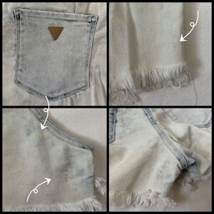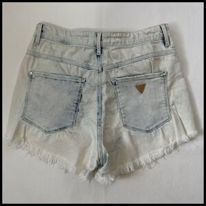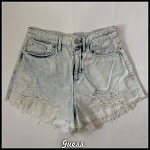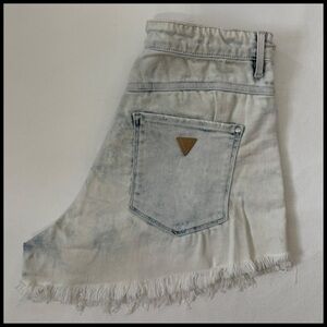 Size 27 light wash frayed shorts from Guess in pre-loved condition with marks in two spots, as shown in photos. •I’m open to fair offers and negotiations on all items!•
