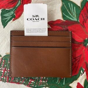 A brand new with tags men’s leather Coach card case measuring 4 x 3. Color is dark saddle with 6 credit card slots