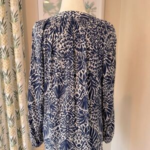 Lilly Pulitzer Silk Top Elsa Navy Blue Long Sleeve Blouse from the design collection By Land Or By Sea. Coastal floral pattern with sea shells in 100% silk.