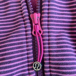 Stay cozy and stylish in this Lululemon Scuba Hoodie with purple and pink stripes. This full-zip hoodie is perfect for your active lifestyle, whether you're heading to the gym or running errands. A Lululemon essential, this sweatshirt will make a perfect addition to the closet of any woman to wear on the go or to stay comfy at home.