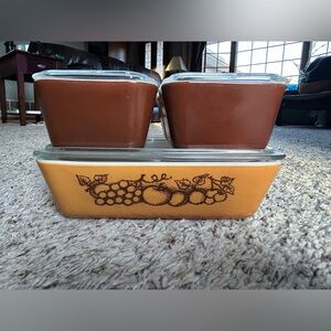 Pyrex Homestead Fridgie set with lids. No chips or cracks. Some flea bites.