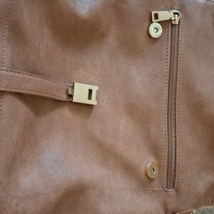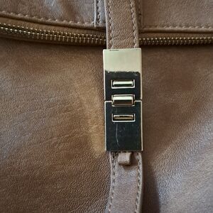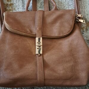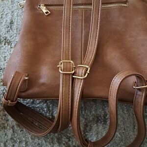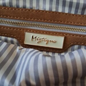 miztique backpack in brown lined in blue and cream stripe has 3 zippers on the outside 2 inside as well as 2 pockets really good size bag
