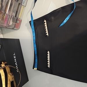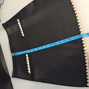 Black vegan leather has really nice stretch to it. It's lined with soft fabric. Really great fit! High-waisted with invisible zipper and off white crochet detail.