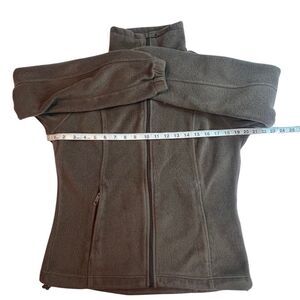 This is a Columbia women's jacket in size Medium, made of brown fleece with a mock neck. It features a full zip closure, embroidered logo accents, and pockets. Ideal for outdoor activities like camping, this mid-length jacket is suitable for winter, fall, and spring seasons. It has a regular fit and is machine washable. Perfect for those who enjoy a nature-inspired, classic style. Measures about 24 inches long and has about a 40-inch chest.