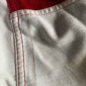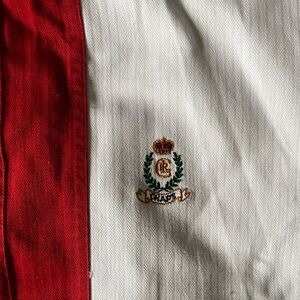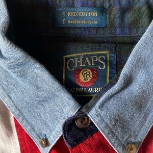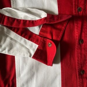 This Vintage Chaps Red And White Stripe Oxford Casual Button Down Shirt Size L is used and in good condition. Armpit to Armpit 26in / Length 32in See pics for visual details (SEE MAGNIFIED PICS; SLIGHT LINEAR DISCOLORATION near hem on back right shoulder near hem)