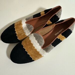 Agnes B wool blend sweater in a navy pinstripe pattern. This sweater snaps up the front with nickel-toned snaps and features a fold-over collar with a small flap at the back - reminiscent of a sailor collar. Attached tie for the waist. Side slits at the hem.