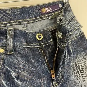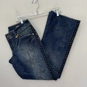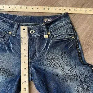 Elevate your denim game with these Akademiks Low Rise Boot Cut Jeans. Featuring a dark blue color and a denim fabric type, these jeans are accented with printed black lace, studded details, buttons, and logos. The jeans have a zip closure, a waist size of 28 inches, and an inseam of 31 inches. The low rise of 8 inches and bootcut style make these jeans a must-have for any 90s rock-themed outfit. With spandex and cotton material, these jeans are comfortable and perfect for everyday wear. The jeans also feature flap button pockets, making them practical for everyday use.
